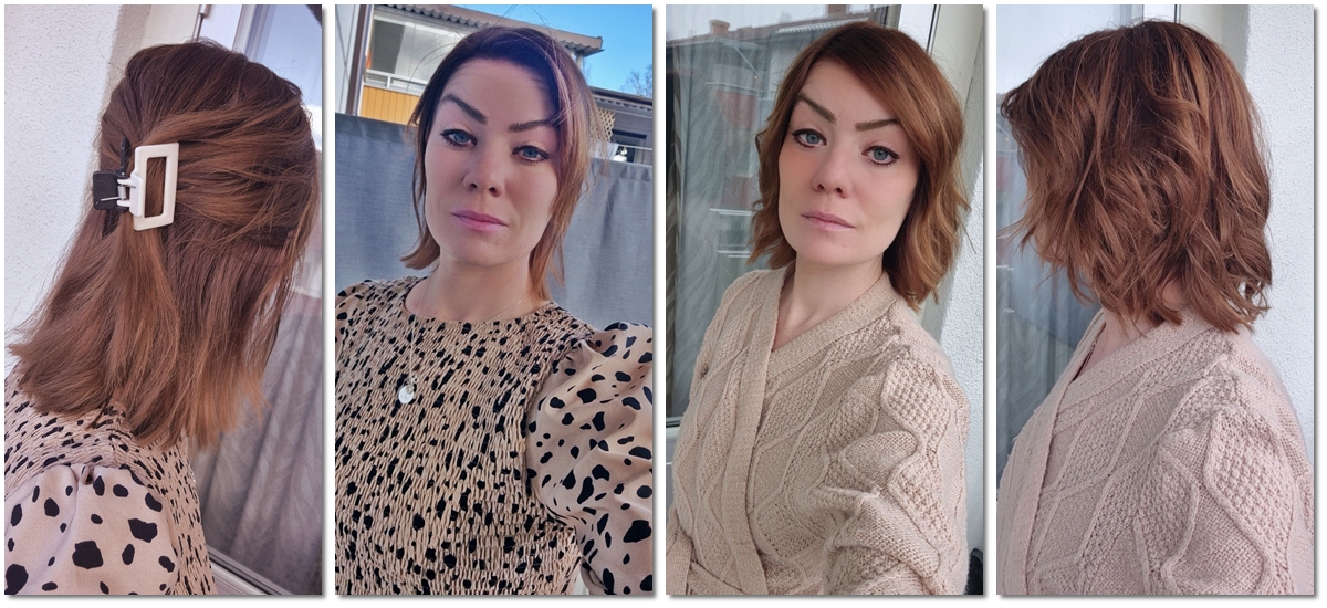 Bilder på mig från igår med klänning och klädd för uppvaktningsbesök och i lördags efter mitt frisörbesök