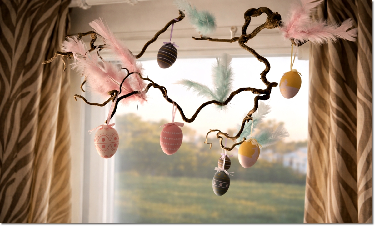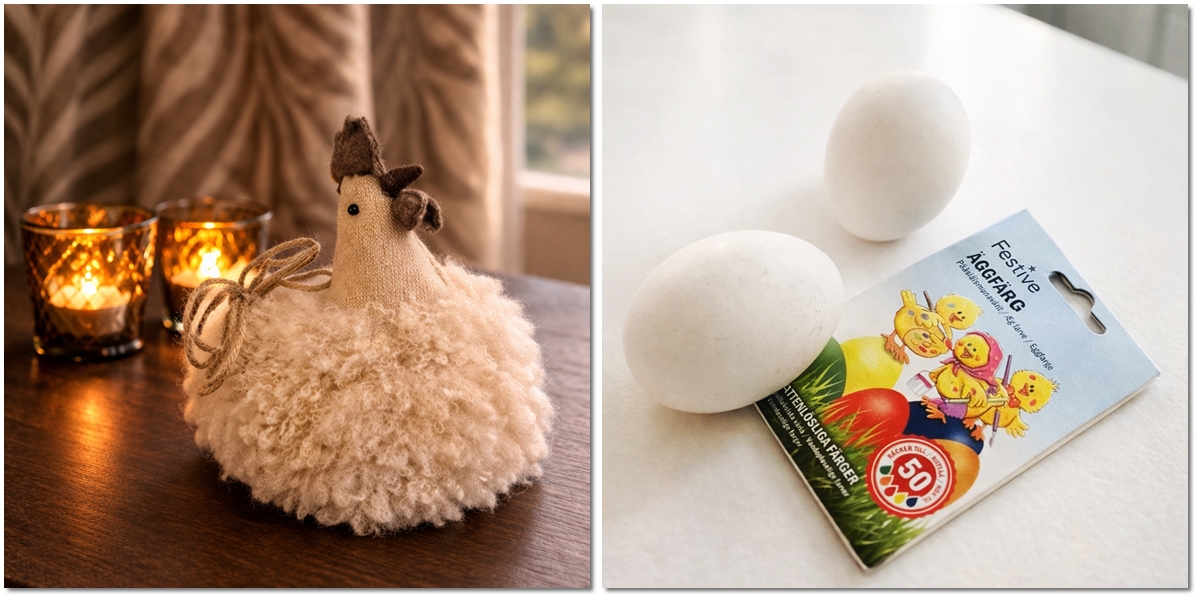 Igår fick mitt ”ormhassel” hängas upp i vardagsrumsfönsret med fina påskdekorationer. Jag har haft dyra fina ➜ gammelrosa påskfjädrar i den innan, men hittar inte på dem. Jag väljer att inte köpa nya eftersom vi ska resa bort över påsken. Det här är billiga fjädrar som jag köpte på Hemköp, tyckte att de får duga. Kanske jag hittar på mina fjädrar. Eller så får jag för mig att åka köpa nya ändå på blomsteraffären, får se hur jag känner i dag efter jobbet. Köpte även färg för att färglägga ägg. Tänkte att Izzy och jag kunde göra det någon dag här. Hon och jag äter mycket ägg.